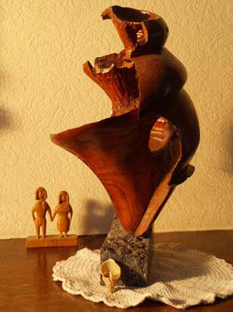 ![]() Torsootje van esdoorn, gepresenteerd op een zuiltje van kerselaar, afgewerkt met steenrood. |